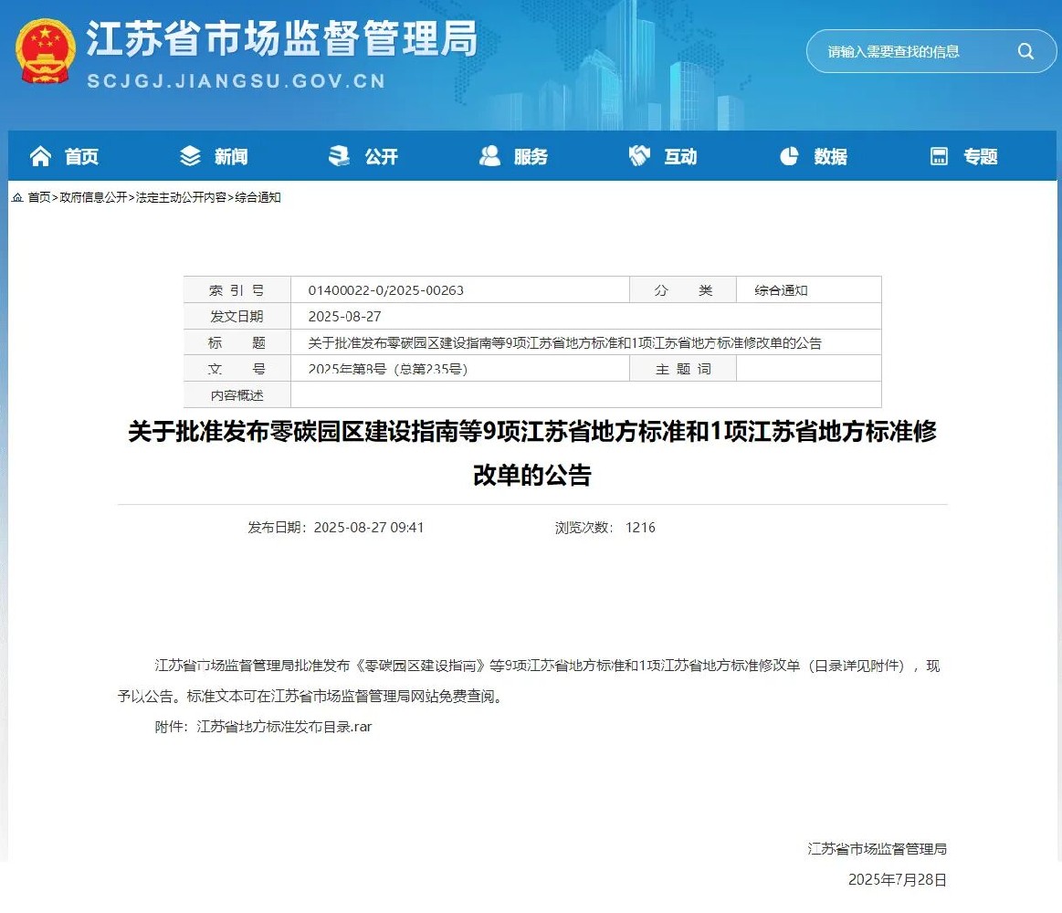 2025年8月28日,《零碳园区建设指南》江苏省地方标准(以下简称《标准》)正式实施。《标准》由江苏省市场监督治理局批准宣布,江苏省生长和革新委员会提出并组织实施,中国质量认证中心有限公司、江苏省战略与生长研究中心(江苏省信息中心)、江苏省工程咨询中心有限公司、中国能源建设集团江苏省电力设计院有限公司、江苏